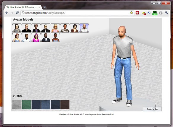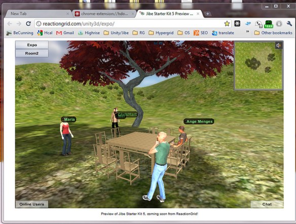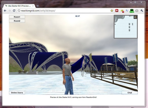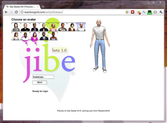 Today we tried out Jibe, a web-accessible virtual world based on Unity3D.  Jibe is made by ReactionGrid (who I currently work for).  We’re in the middle of putting up more information about Jibe on the ReactionGrid website, but in the meantime you can read an “Executive Summary of Jibe” that I recently wrote to help folks understand exactly how it all works.