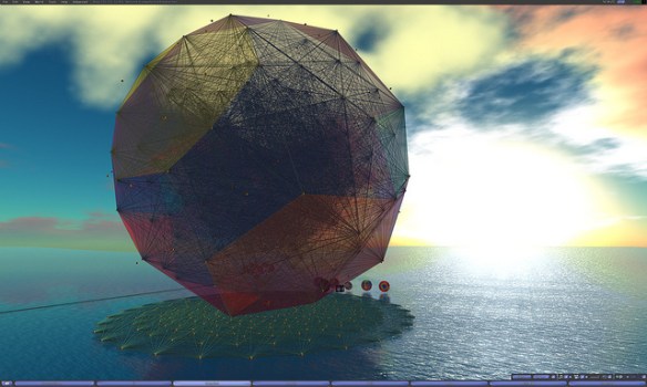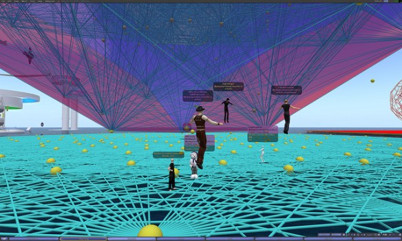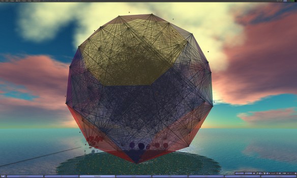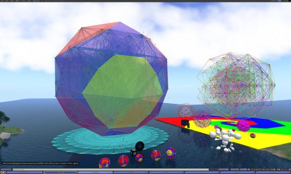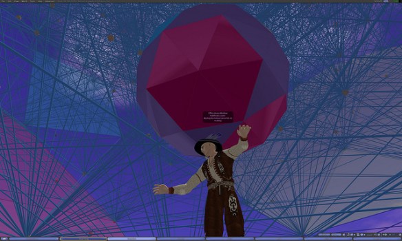 At this meeting visited the region Wizzy on ReactionGrid.  At this location, Wizard Gynoid has created a giant model of the E8 Polytope, one of the most complex and elegantly beautiful geometric objects known to mathematicians.