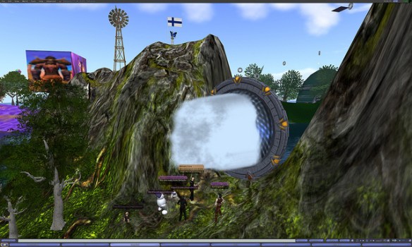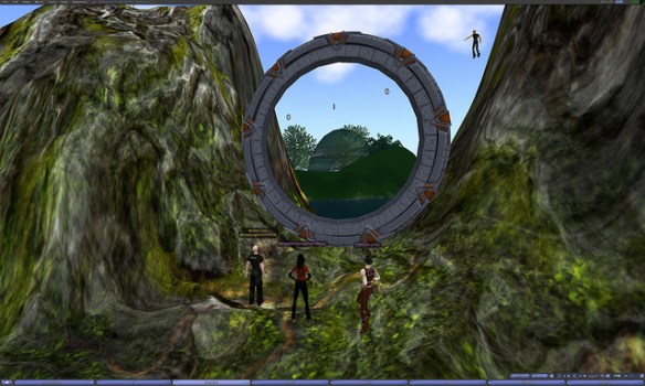We could make this single Hypergrid Jump the manual way, but I thought we’d try something a bit more fun for today.  I recently found a beautifully detailed Stargate artifact on FrancoGrid.  It seems to be designed like the Stargates often found in Second Life, allowing people to make normal teleports to different regions.  But I discovered that I could get it to work with Hypergrid addresses.   I have programmed and placed one of these Stargates to the SouthEast of our fire circle on Pathlandia.  It’s quite large, so you can’t miss it.