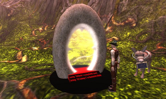 We’ll be making this jump using one of the instant Hypergates on Pathlandia.  It’s the stone archway near the Tardis.   Just walk up to the archway and walk through it.  You will automatically make a Hypergrid jump to “HG Gateway 1.”