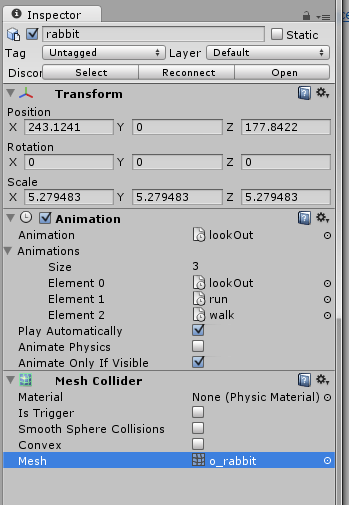 I’ve been messing with audio, and the triggering thereof, a fair bit for my own project and I just wanted to highlight a couple of things from the above that you may not have known. Firstly, you can disable the mesh renderer to hide the sphere as you have done above, but if the sphere never needs to be visible you can remove the Mesh renderer component altogether (click the little gear wheel top right and choose Remove Component). Similarly, if you’re not going to render it then you don’t actually need the mesh! Again use remove Component. This then just leaves you with the sphere collider which is the bit you’re using as your actual trigger. It doesn’t save a lot, but if you had a scene with a great many such rabbits then all those saved sphere meshes would add up!