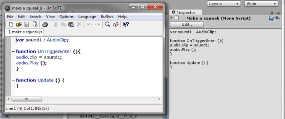 See that blue area in the Inspector window?  You need to tell the “make a squeak” script what sound file to use.  Just click on the little circle all the way on the right and choose your “squeak” sound file from the list.  Then the script will know what audio clip to play.