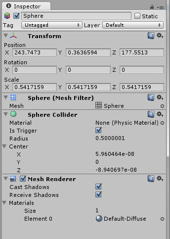 You don’t want people to actually see the sphere, so make it invisible by unchecking the box next to “Mesh Renderer” in the Inspector window.