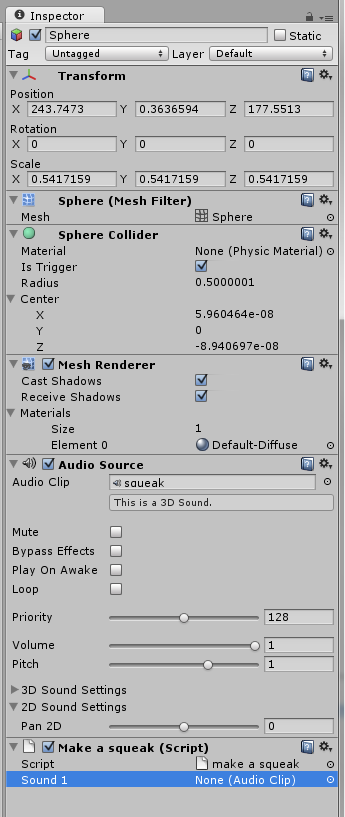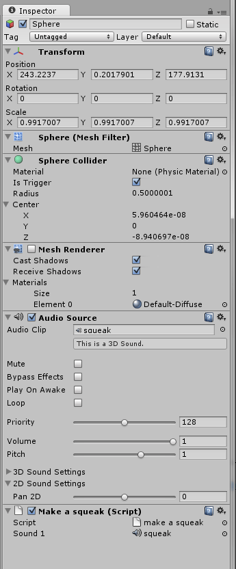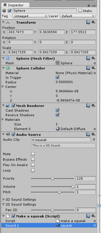 Once you’ve saved the script, drag the script file from your Project window onto the Sphere.  And drag the “squeak” sound file onto the Sphere as well.