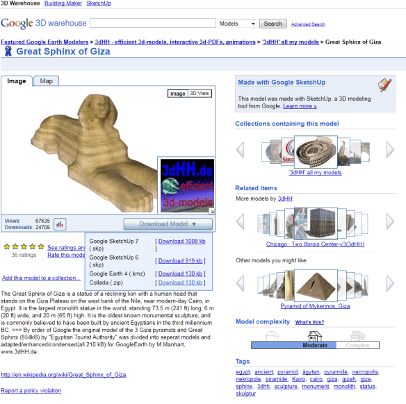 We’ve found our Sphinx!  Click the Download Model button and download it as a Google Sketchup 7 file.