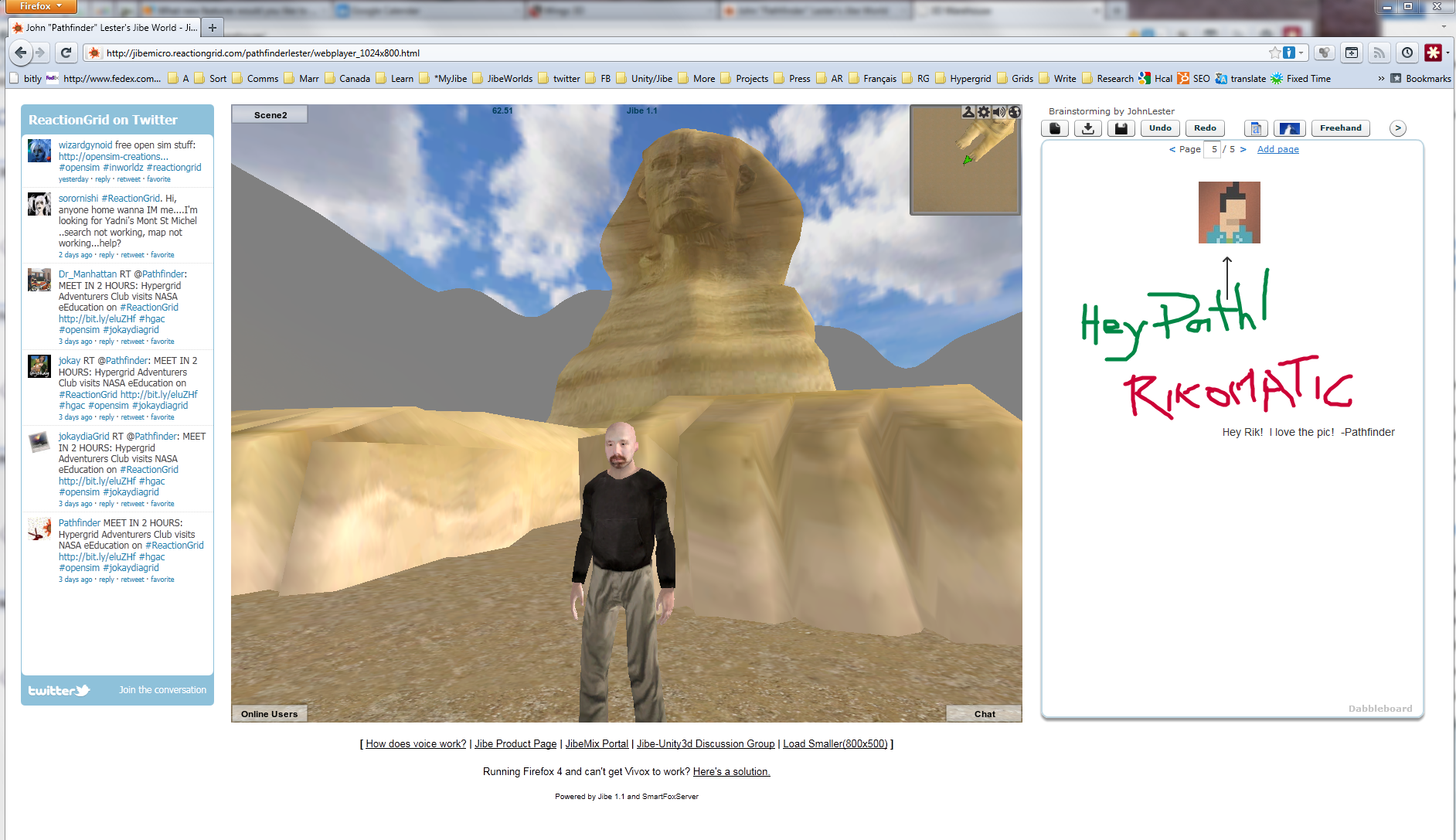 Search the forest around my Jibe world for a magical flower garden.  From there, you’ll see the Sphinx in the distance.  I scaled the Sphinx up so that it’s accurately sized in relation to your avatar, so it’s pretty hard to miss.