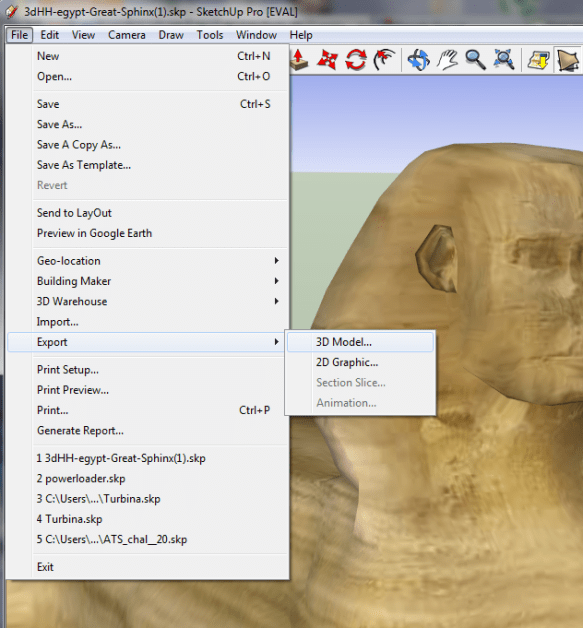 So go ahead and open up the Sphinx model in Google Sketchup Pro, then use File > Export > 3D Model to save it in FBX format.