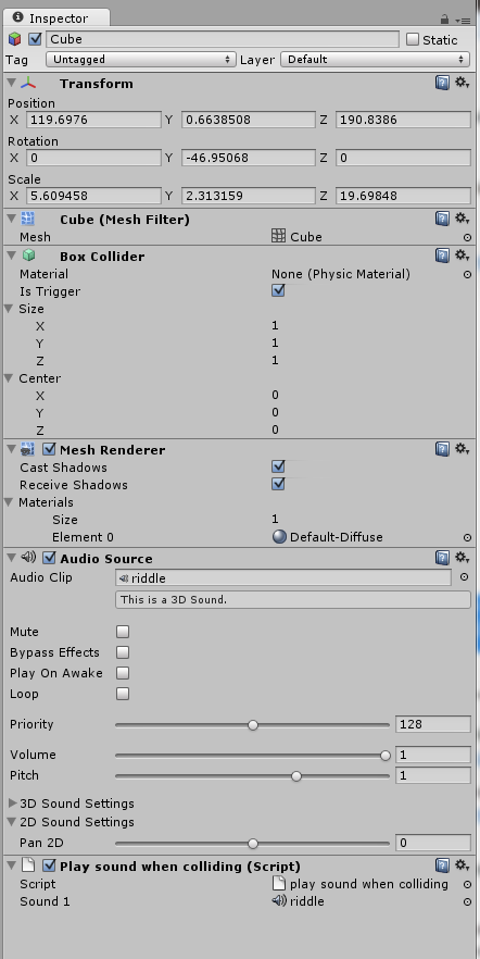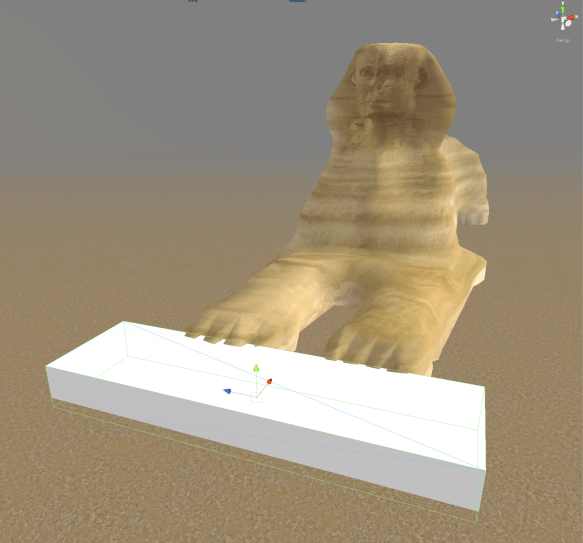 I explained in a previous blog post how to set up a basic Trigger in Unity that will cause a sound file to be played when an avatar walks into the area defined by an object.  Please see that blog post for how to set up the trigger script.  The only difference with the Sphinx is that we’re going to use a cube GameObject as the collider, and the sound file we’re going to play will be a recording of someone reading a riddle aloud.
