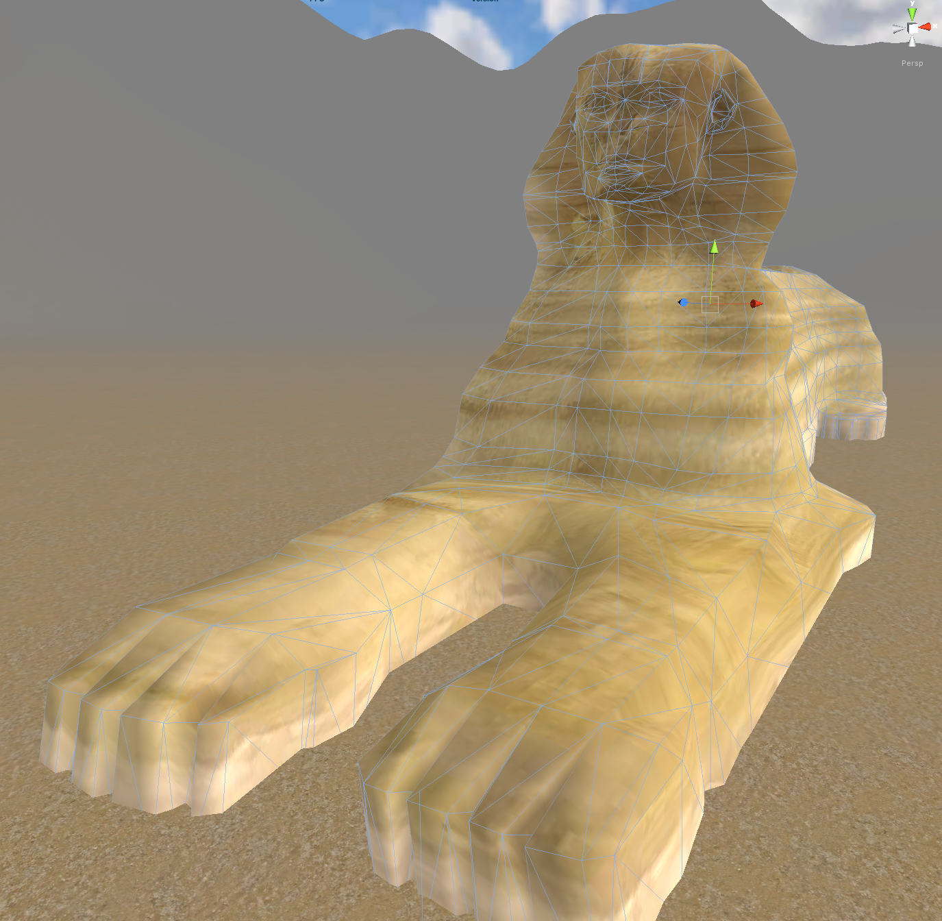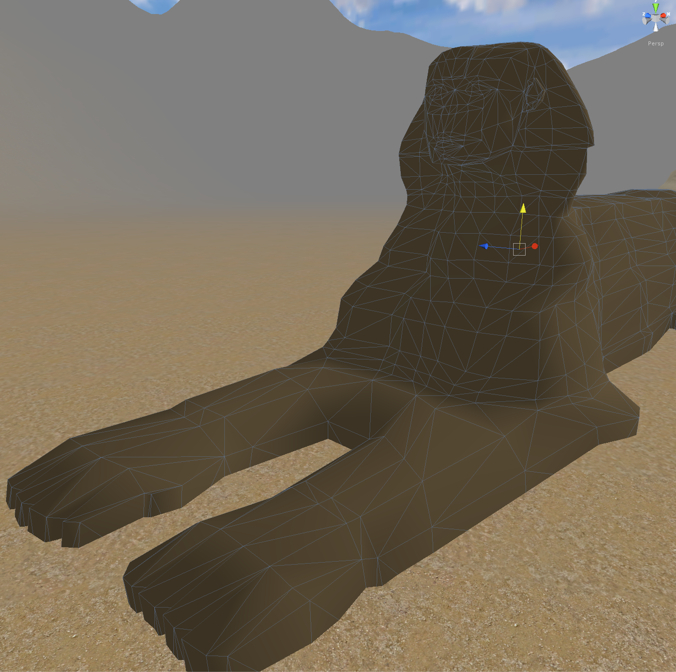 As you can see above, your Sphinx will initially be missing its texture.  To fix this, just find the .jpg texture file in your Project window and drag it onto the Sphinx model in your Scene window.  That will apply the texture to the model.