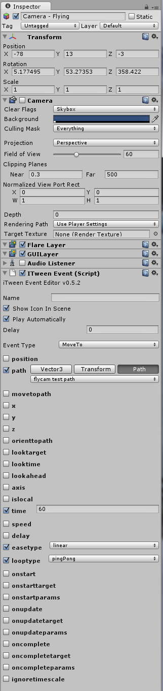 In the Inspector window, modify the settings in the ITween Event (Script) component so that your camera will be following a path (select “flycam test path” from the pulldown menu) and choose whatever additional iTween Event settings you wish. I wanted my camera to automatically follow a basic path back and forth in a pingpong loop, and you can see how I did that below.