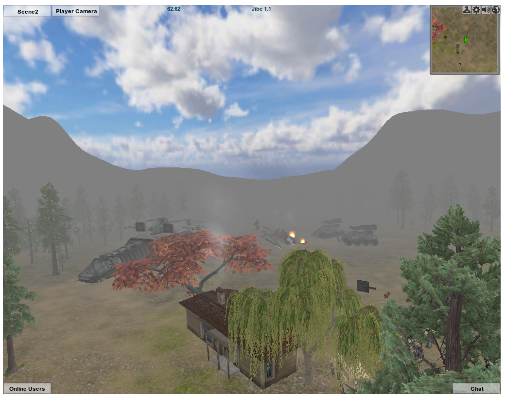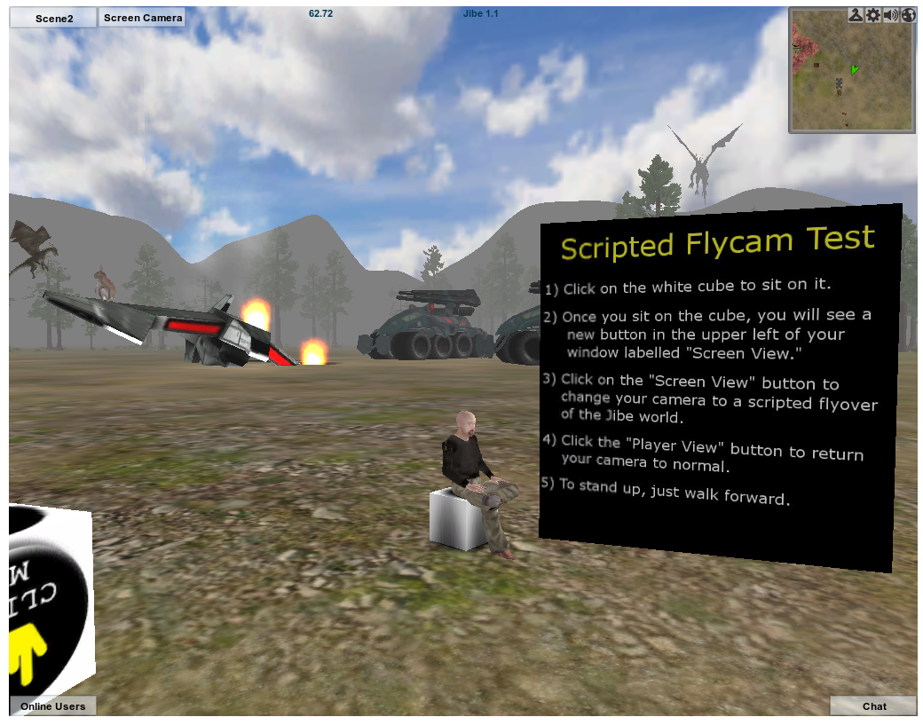 Once someone sits down, they will see a new button in the upper left of their Jibe window labelled Screen Camera. If they click on that button, they will immediately see the view from the Camera – Flying GameObject that is flying around your Jibe world.