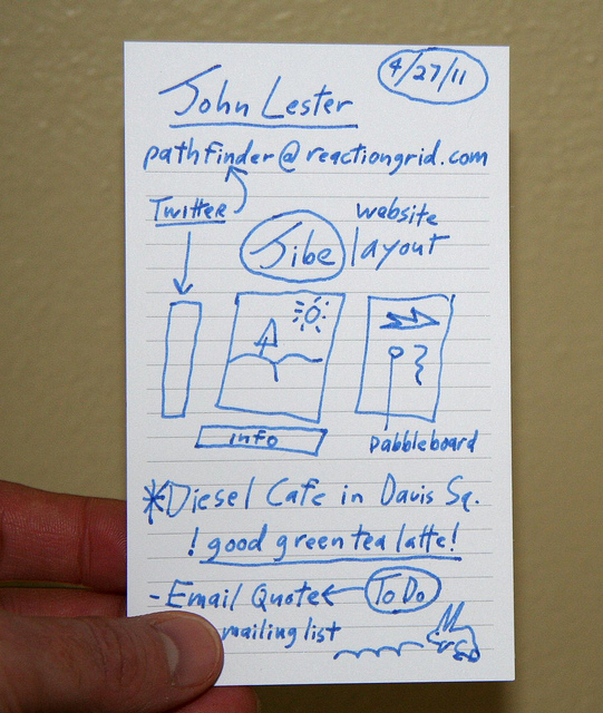 2. Long time ago, I had several sets of cards printed up. One had my “businessy” business info for office-type stuff-fixing computers, making websites; very clean and office-y. Others had various “personal” and artsy layouts- fun code, alternate emails, creative presentations of myself, etc. I always left plenty of space in the design for additions by myself or by the other person, and generally scribbled something on each card I gave out as a reminder to the person of what/when/how we connected for that personal touch. To print a batch of business cards is so inexpensive now that it’s simple to print several different types of cards (even some ‘calling cards’ or meishi.