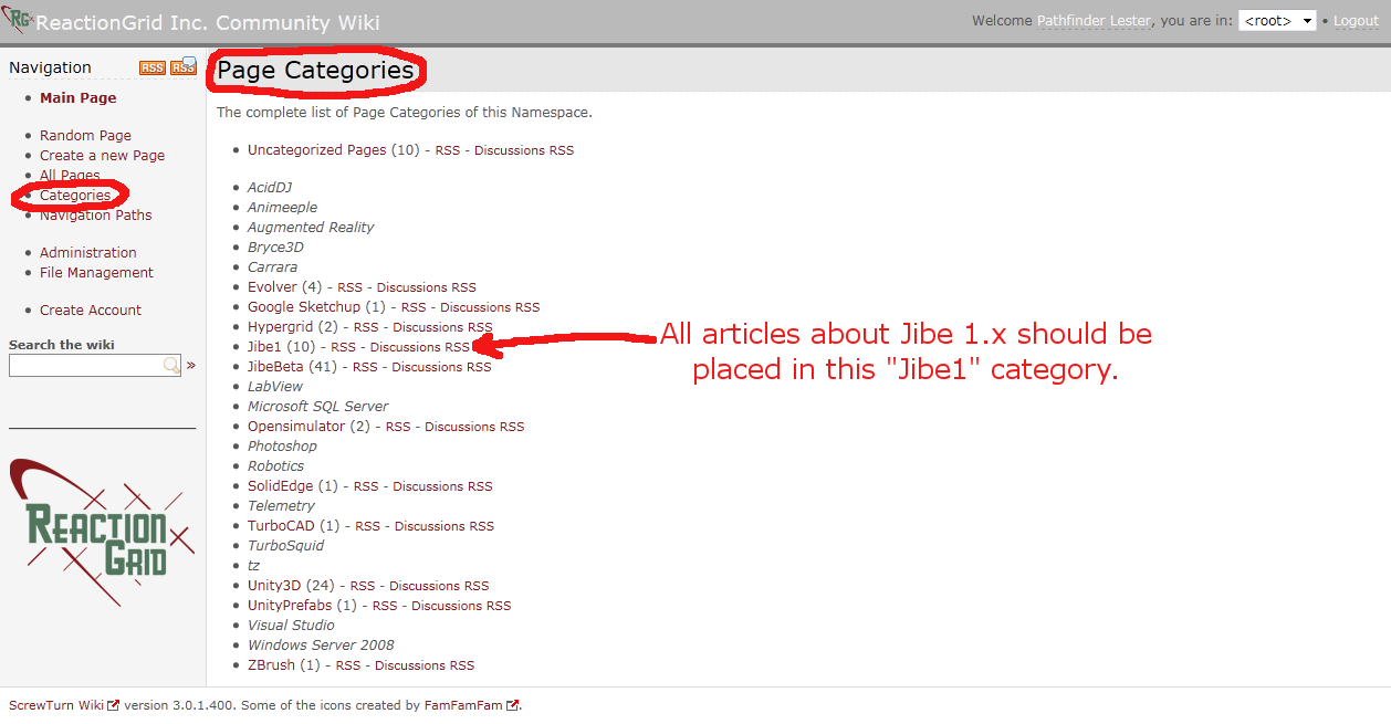 If you click on the Categories link on the left, you’ll see a list of all the different Categories in the wiki.  All articles about Jibe 1.x can be found in the Jibe1 category.
