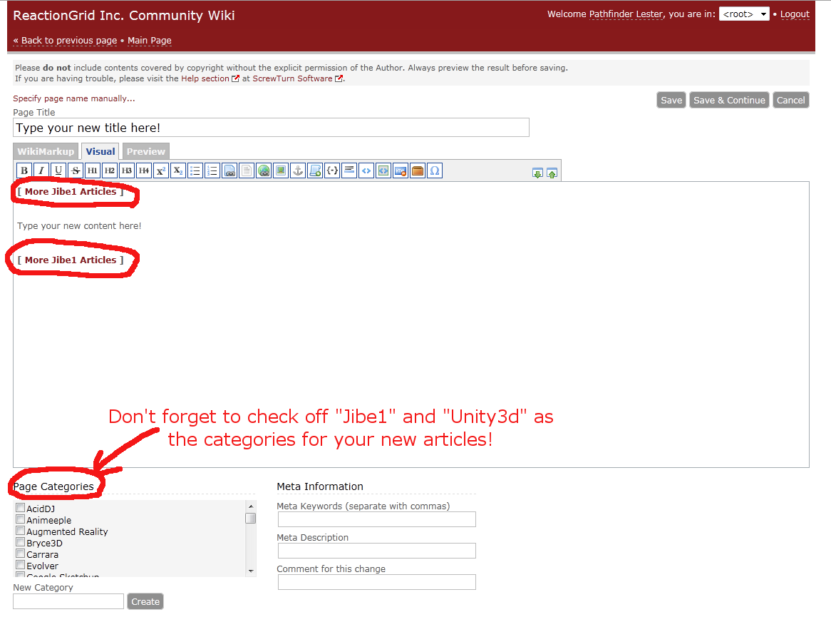 You’ll also notice a section in the article editor called Page Categories.  That’s where you can choose which categories you want an article to be listed under.  I suggest you place any new article about Jibe in both the Jibe1 and Unity3d categories.