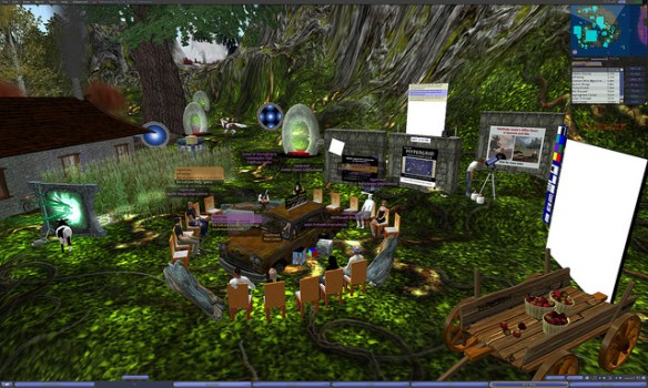 To visit the Fair, just go to the ReactionGrid homepage and Register an account. Once you log in to the ReactionGrid public grid, teleport to the region 39FairHQ.