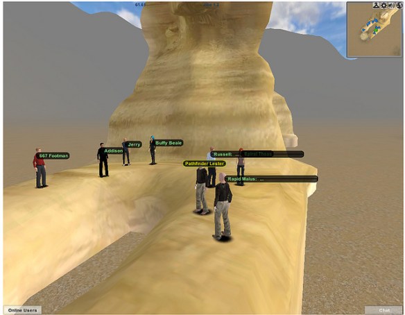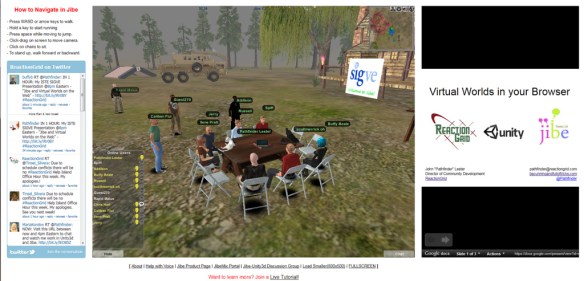Folks logged in to my Jibe world where I addressed the group using voice while people asked questions in text chat. We sat around for a brief introduction then went on a walking tour to illustrate how Jibe can be used to create immersive and interactive learning experiences. I also spoke about the unique affordances of having a 3d virtual world embedded on a web page.