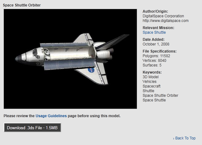 Finding a model of the Space Shuttle Orbiter was easy. NASA has a great website with lots of freely available models. I found the model I wanted right here.