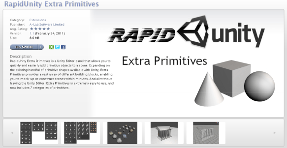 If you go to the Unity Asset Store and search for “primitives,” you’ll find a few things in a category called Extensions.  Extensions are packages you can download that will add new features to the Unity editor itself.  And here’s a nice package that will give you the ability to use more primitive shapes.