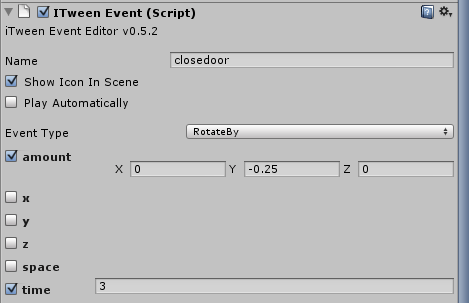 For the “closeDoor” iTween event, again set the iTween to “Rotate To”, select the “rotation” box, and then leave the values at 0. Check the “time” box again, and then set it to 3 or whatever value you had set the previous “openDoor” event.