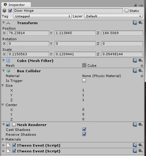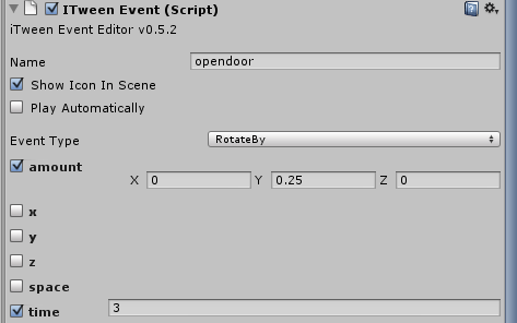A better result can be achieved by instructing people to use the iTween “Rotate To”. Once selected, then approach it the same was as you listed in your blog, however this time you will be checking the “rotation” box. Then, in the Vector3 tab, under whichever axis you wish, input 90 deg, or -90 degrees for the “openDoor” iTween. Then check the “Time” box, and set it to a nice value, 3 will also work for this case.