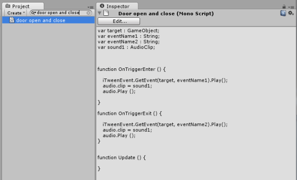 Name your script door open and close in your Project folder.  Click the Edit button and paste in the following code: