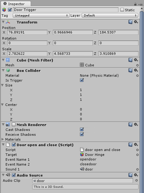 Finally, look carefully at the Inspector window view of your Door Trigger object.  Make sure that Event Name 1 and 2 are set to opendoor and closedoor respectively, that Sound 1 is set to the name of your door sound, and that the Target is set to the Door Hinge object in your scene.