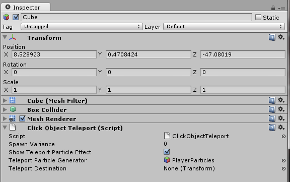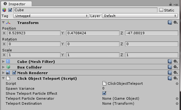 Now, go to your Project window and drag your ClickObjectTeleport script into your cube object.