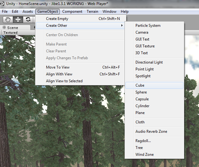 You can place your ClickObjectTeleport script inside any object in your Jibe world that you want to use as a clickable teleportation device. Let’s use a cube for this example.