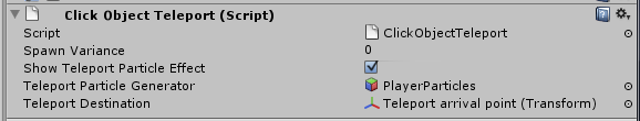Find a copy PlayerParticles in your Project folder and drag it onto the Teleport Particle Generator field in the Inspector settings. This will generate a nice particle effect when avatars teleport.