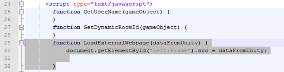 Open up the webpage where you have your Jibe world embedded.   The default.html file we ship with Jibe has some Javascript already in there, so just add the following bit of code at this location: