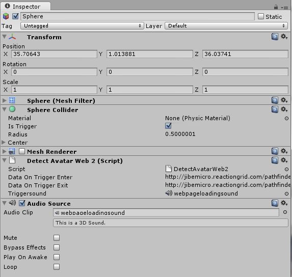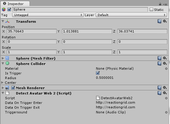 Save your modified DetectAvatarWeb2 script.  Then drag a copy of it from your Project window into your sphere object.