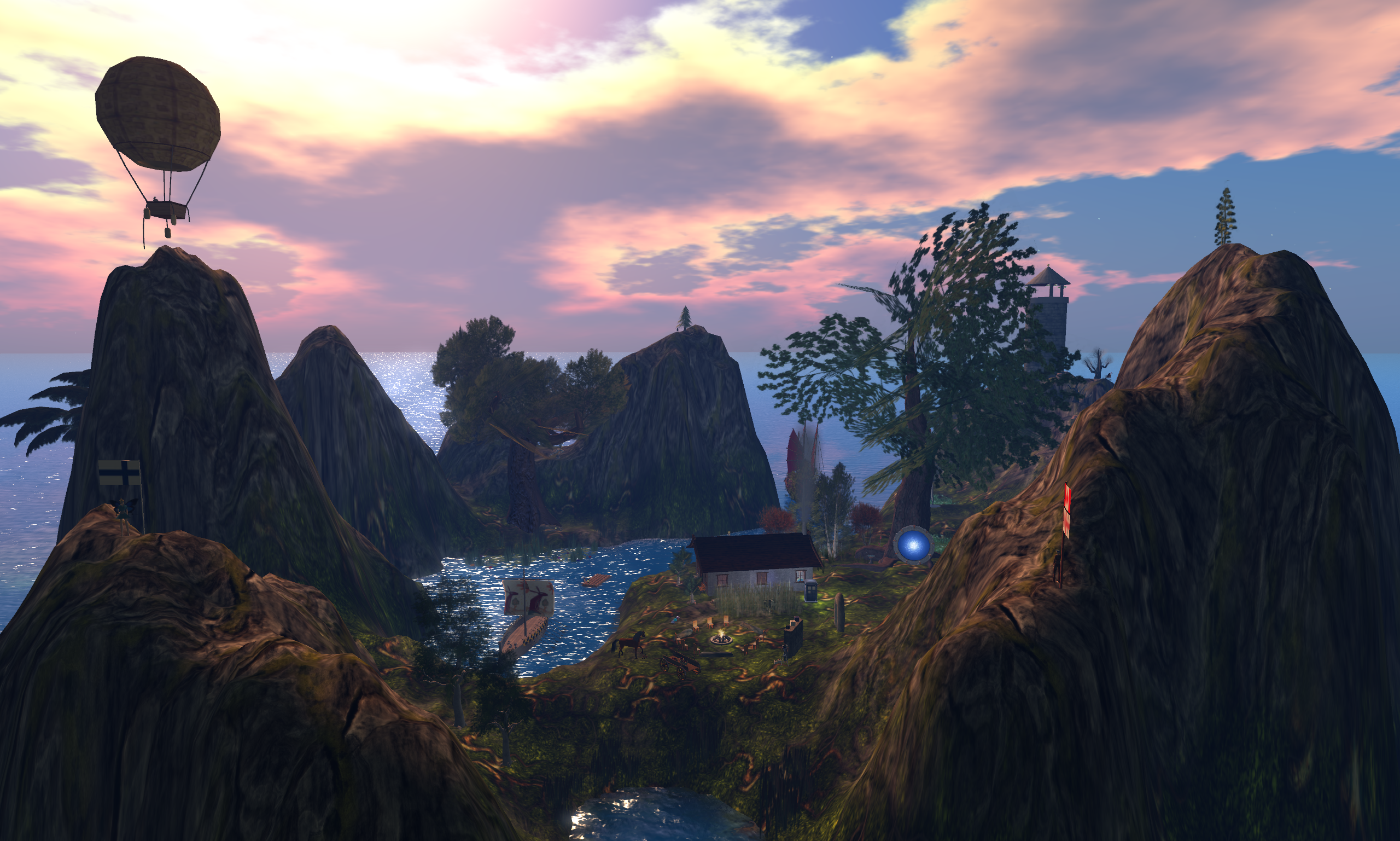 My grid “Pathlandia” is currently using Diva Canto’s Diva Standalone software [OpenSim 0.9.0.0 Release, Diva release], and I use Ener Hax’s SimonaStick for a simple database solution. Pathlandia Grid has just one region (named Pathlandia), but I upgraded it to a 768m x 768m varregion so it’s as large as 9 conventional 256m x 256m regions laid out in a square (3 regions x 3 regions). Visitors are always welcome! There are many freely copyable curios and curiosities on the island, so please take copies of anything that catches your eye. Enable Lightshare in your viewer when visiting to get the full effect of Pathlandia’s customized sky settings.