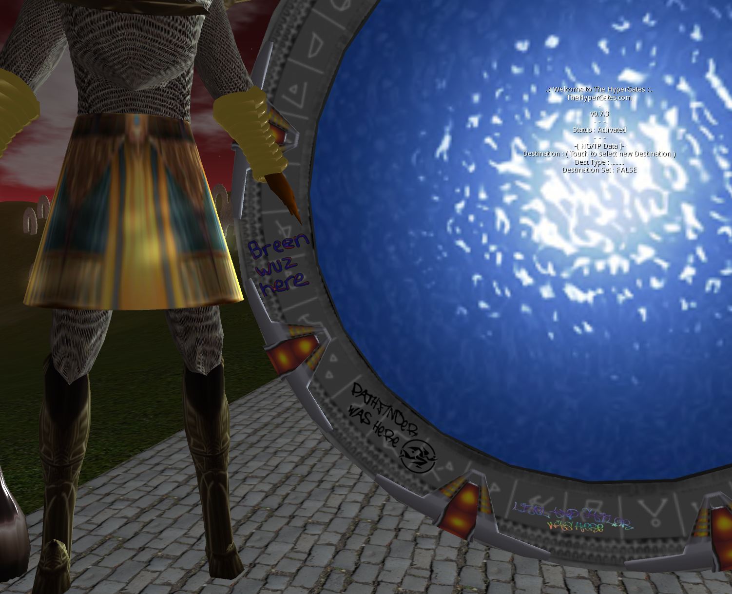 These flags typically have hovertext indicating the person’s home grid, and the image on the flag itself is usually either the flag of the visitor’s home country or a symbol of their home grid.  Groups of flags seem to most commonly spring up next to Hypergates.  And in addition to flags, in some places I’ve noticed graffiti tags left by visitors.