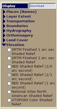 On the right hand side, there is a display panel with several drop downs.  Deselect everything (a bit painful) and select “NED Shaded Relief (1/3 arc second)”  This relates to the level of detail in the data.  1/3 is the more detailed than the 1 arc sec, but less than 1/9.  1/3 creates fairly large download and you may be able to get by with 1 arc second since this all goes down to 256×256 pixels.