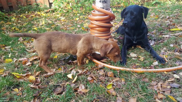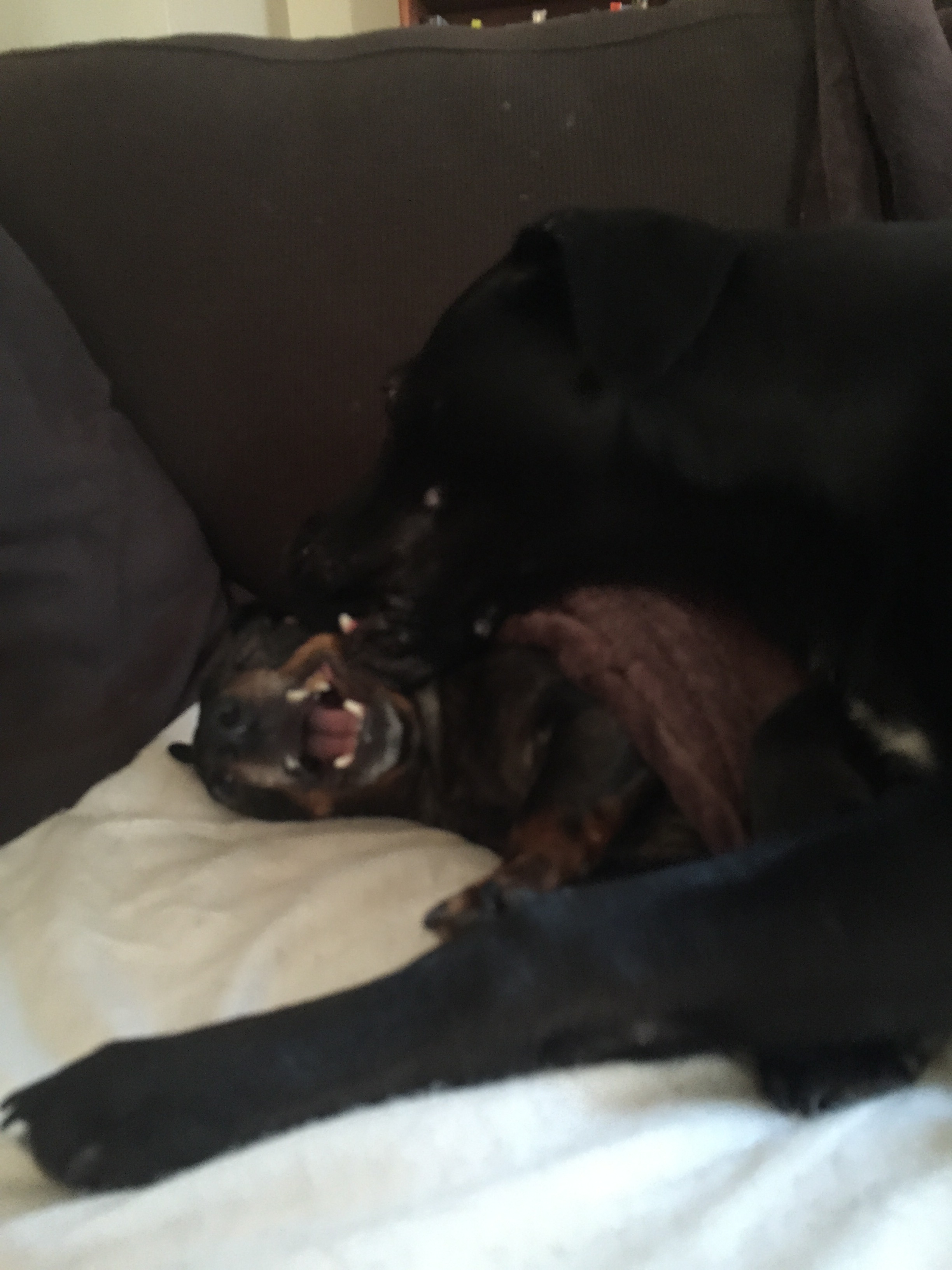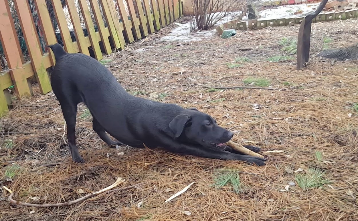 He likes to play in the yard with Samantha. Even though he is very strong, he is careful when playing with her and (mostly) pretty gentle.