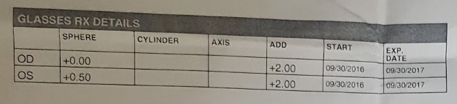 Turns out I’m not doing too bad. Age happens, so yeah, my ol’ eyeball lenses are having a more difficult time focusing on the closeup stuff. After talking with the optometrist and going over my prescription (here’s a helpful page for interpreting eyeglass prescriptions) I decided to get a pair of glasses with progressive lenses. I hate having to keep taking my reading glasses on and off, so I’m going to try wearing these new glasses all the time.