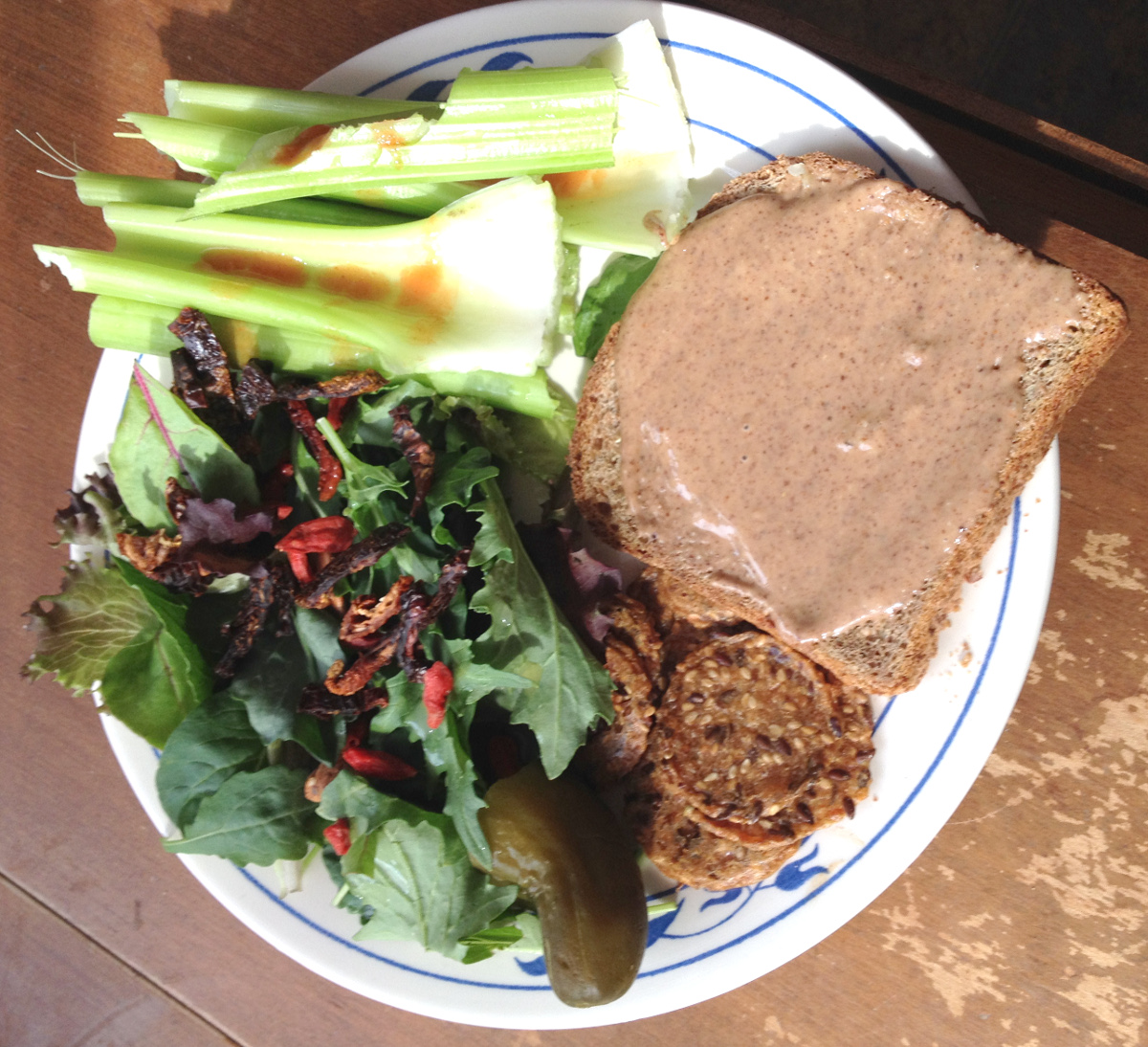 Fresh celery with Frank’s RedHot. A toasted slice of Ezekiel sprouted whole grain bread with Nuts to You raw organic almond butter.  Half of a Bubbies dill pickle.  A handful of Mary’s Gone crackers. Baby kale salad sprinkled with lemon juice, dried goji berries, sun dried tomatoes and a few whole raw almonds.